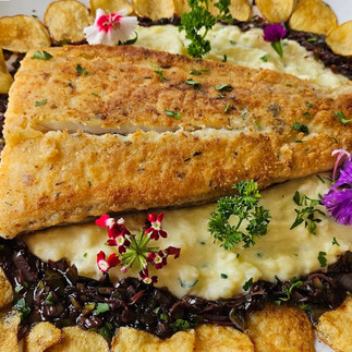 Peixe em crosta de castanhas: Uma criação especial do Chef, que combina crocância e sabor, servido com purê de mandioquinha.
